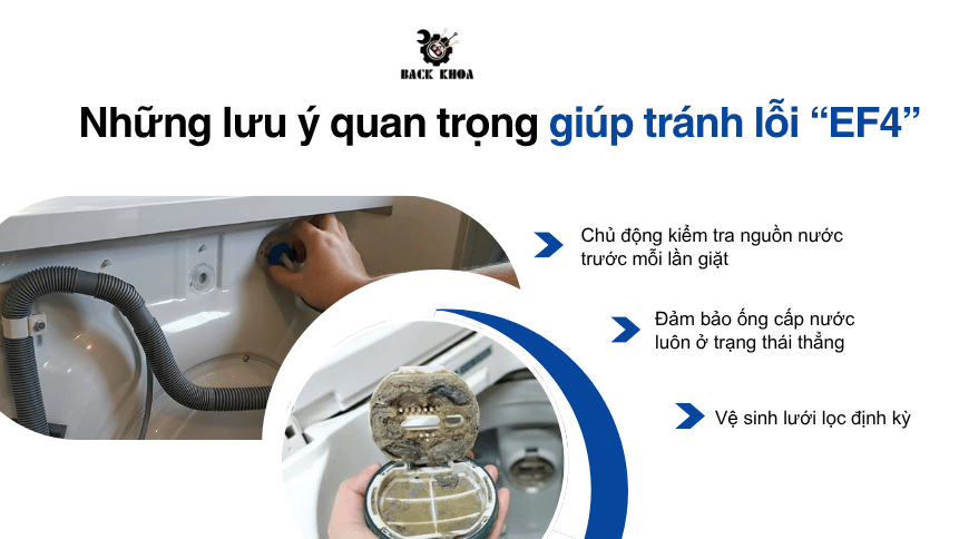 Bên cạnh đó, bạn cũng nên quan sát hoạt động của máy theo thời gian. Nếu nhận thấy nước cấp vào chậm hơn bình thường hoặc chu trình giặt kéo dài bất thường, đây có thể là dấu hiệu sớm của lỗi EF4 và nên kiểm tra ngay để tránh phát sinh sự cố lớn hơn.